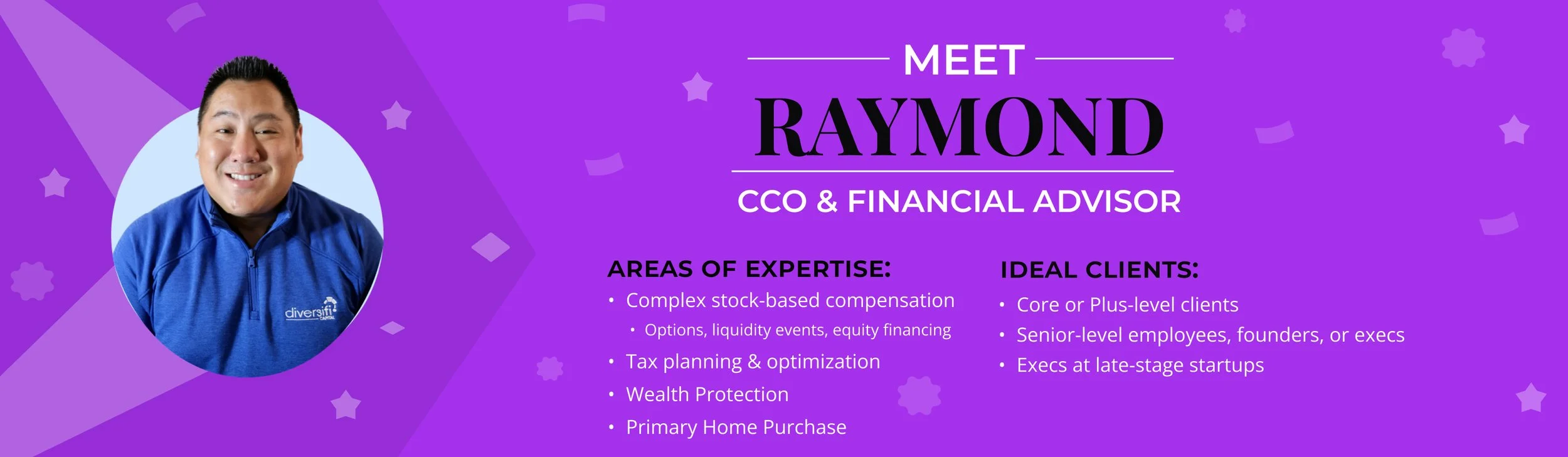 Raymond is one of the co-founders of DiversiFi Capital, and currently helps lead the advisory team while also serving as the firm’s Chief Compliance Officer. In this dual role,Raymond’s main focus is advising his clients with the responsibility of overseeing compliance across the entire company, ensuring that DiversiFi continues to uphold the highest standards of integrity and trust.