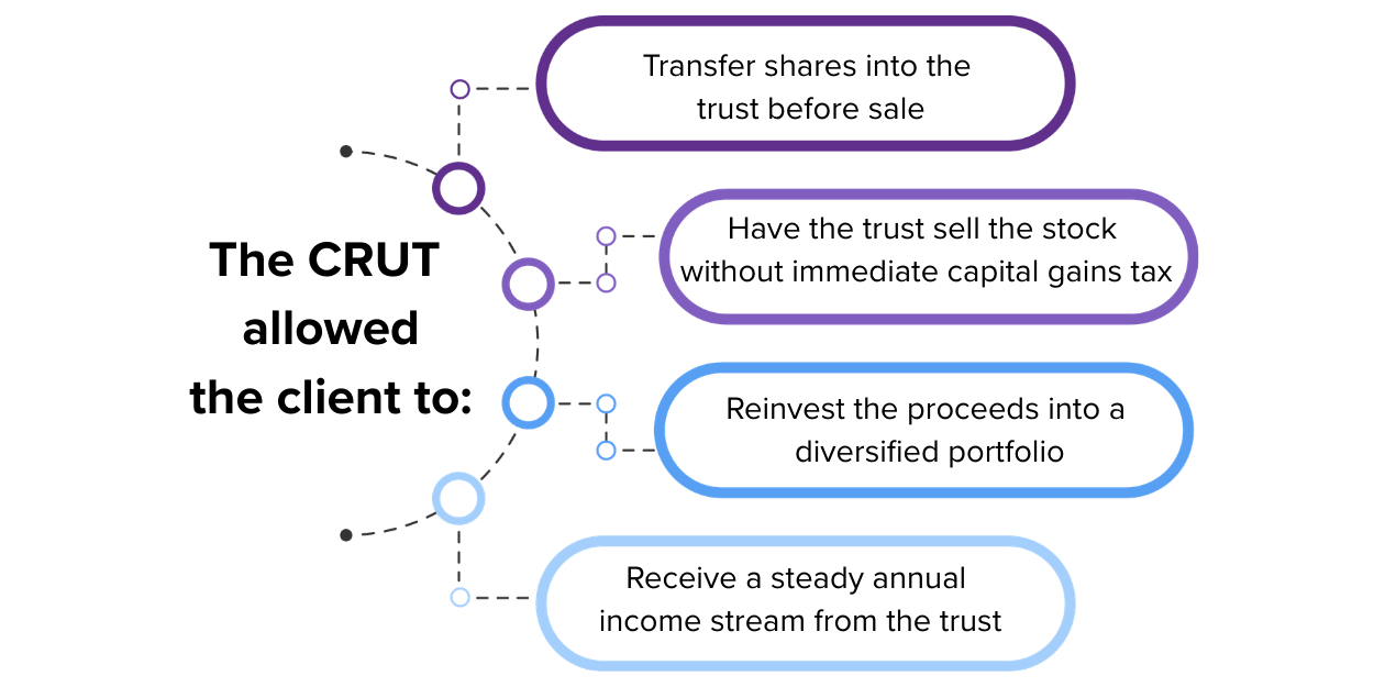 The strategy delivered several meaningful benefits, both financial and personal. It reduced the client’s concentration risk in a single stock, bringing greater balance and peace of mind to their portfolio. At the same time, it created a reliable lifetime income stream tied to the value of the trust, providing long-term financial stability.