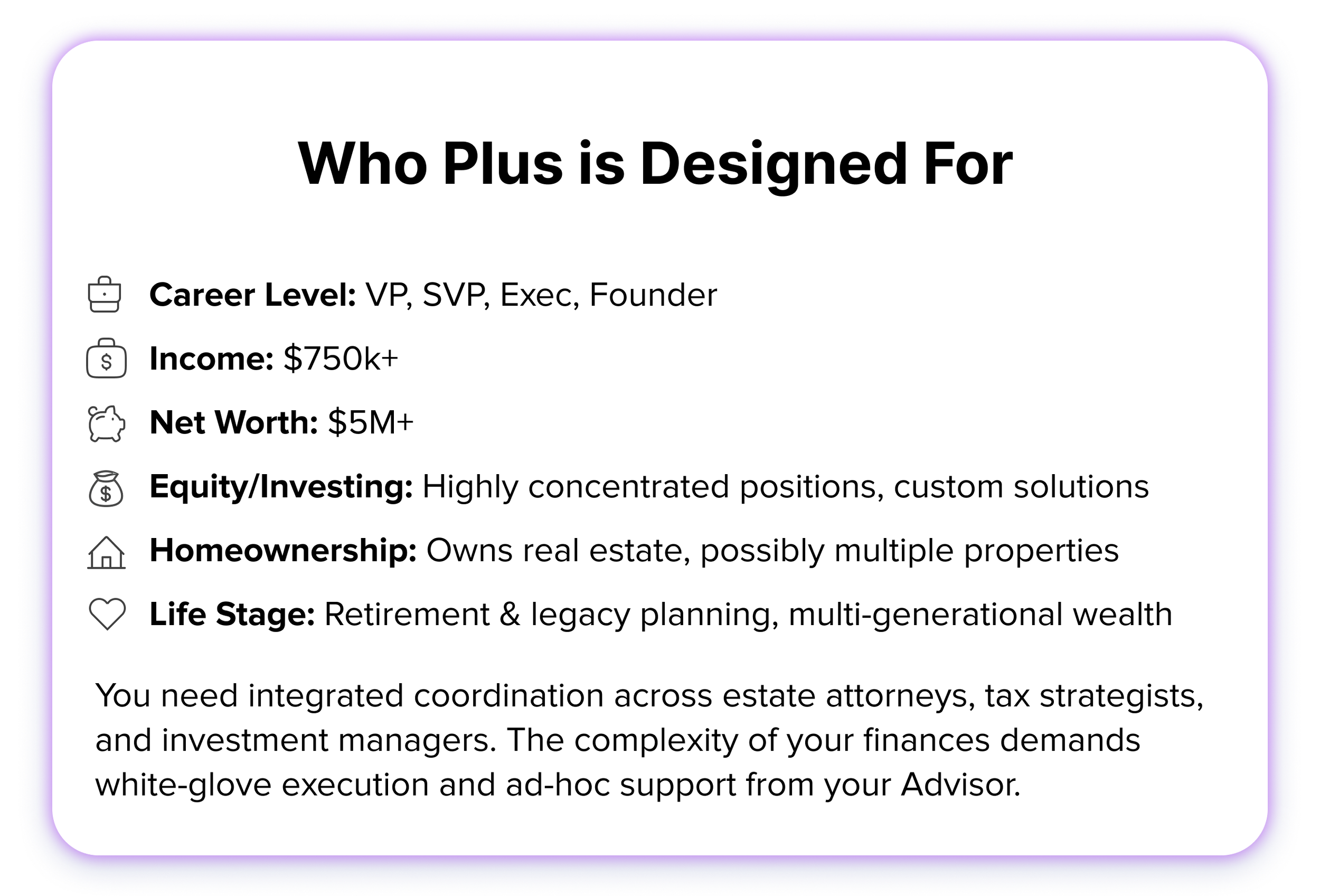 Plus is built for high-net-worth professionals, founders, and executives whose wealth requires coordinated, sophisticated execution. For households where financial decisions span multiple generations, tax strategies involve significant complexity, and estate planning has become a priority, coordinated planning may be worth exploring. This tier provides white-glove service, same-day responsiveness, and family office-level coordination across all your advisors.